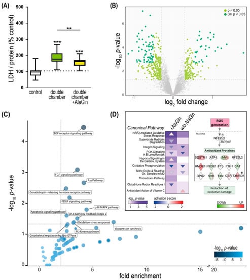 Effects of addition of alanyl-glutamine (AlaGln) to double-chamber PD fluids on endothelial cells. (A) Total protein-corrected lactate dehydrogenase (LDH) release into the cell supernatant (n = 3 individual experiments from three different donors, each comprising in total 18 samples, means ± SEM). ** p < 0.01; *** p < 0.001 (ANOVA, post hoc: Tukey’s). (B) Volcano plots for regulated proteins in HUVEC exposed to double-chamber PD fluid with added 8 mM AlaGln vs. double-chamber PD fluid without the additive. Colored points are LIMMA p < 0.05 and log2[fold change] > 0.3. Dark green: adjusted p < 0.05 after Benjamini-Hochberg (BH) correction for multiple testing. (C) Panther pathways analysis for the proteins regulated by AlaGln in double-chamber PD fluid. Each bubble represents a pathway, the intensity of the blue color is proportional to the p-value. Significantly enriched pathways are labeled with their respective names (Fisher’s exact p < 0.05, fold enrichment > 2). (D) Heatmap of significantly (Fisher’s exact p < 0.05) regulated IPA canonical pathways following double-chamber fluid exposure compared with double-chamber PD fluid supplemented with 8 mM AlaGln. Only oxidative stress related pathways are shown. The p-value is visualized in violet by fill color intensity. Activation z-scores are indicated as up (activated; red) or down (deactivated; blue) colored arrows. The direction of the arrow reflects the direction of the regulation (predicted activation: up, predicted inhibition: down). The NRF2-mediated Oxidative Stress Response pathway was extracted from IPA, manually curated and modified, and overlaid with differentially regulated proteins following exposure to double-chamber PD fluid with AlaGln vs. double-chamber PD fluid alone. Down-regulated proteins (green) and up-regulated proteins (red) * p = 0.042 (LIMMA).