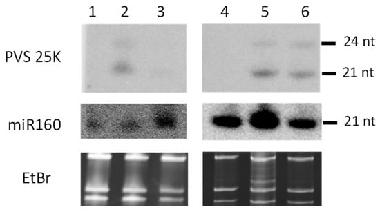 Total RNA was extracted for potato-leaf tissues, using a CTAB-LiCl method as described previously [], and was quantified by using a NanoDrop 2000c Spectrophotometer (Thermo Fisher Scientific, Rockford, IL, USA). Small RNA blot hybridization analysis was performed as described previously []. Briefly, 10 μg total RNA was loaded on 15% denaturing polyacrylamide–urea gel. After gel electrophoresis and gel staining with ethidium bromide, RNA was transferred onto nylon membrane Hybond-N+ by blotting, followed by UV crosslinking. The membrane was hybridized successively with two 32P-labeled DNA oligonucleotide probes specific for PVS 25K sequence and plant miRNA (miR160) (Dataset S1A).