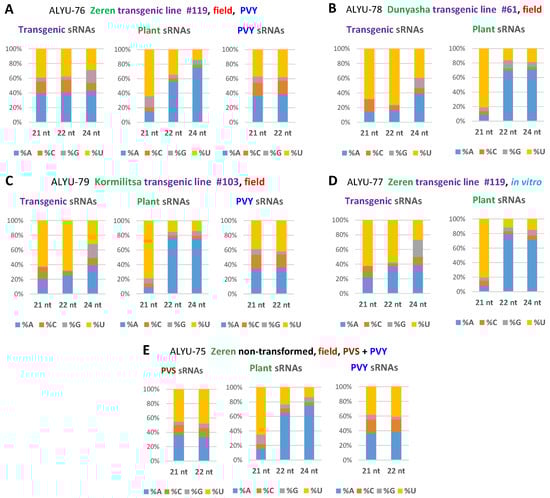 The 5′-nucleotide profiles of major size classes of transgenic, plant, and viral sRNAs. Redundant 20–25 nt sRNA reads from leaf samples of the transgenic lines of cultivars Zeren (line #119: field plant ALYU-76 and in vitro plant ALYU-77), Dunyasha (line #61: field plant ALYU-78), and Kormilitsa (line #103: field plant ALYU-79) and from a non-transformed Zeren plant (field plant ALYU-75) were mapped with zero mismatches to reference sequences of the transgene expression cassette, the S. tuberosum genome, and the reconstructed genomes of viruses (PVS and/or PVY) present in some of the plants (Dataset S1B); and the mapped sRNAs were sorted by size and 5′-terminal nucleotide identity (5′A, 5′C, 5′G, and 5′U) and counted (Dataset S2C). The frequencies of each 5′-nucleotide (in % of total) for each major size-class are plotted as bar graphs and color-coded. Panels show the resulting 5´-nucleotide profiles for the plants ALYU-76 (A), ALYU-78 (B), ALYU-79 (C), ALYU-77 (D) and ALYU-76 (E).