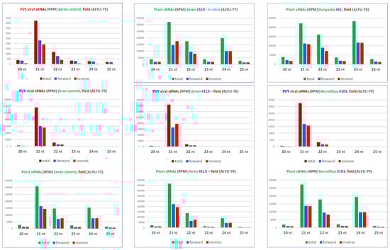 Size profiles of virus-derived and plant sRNAs. Redundant 20–25 nt sRNA reads from leaf samples of the non-transformed plant of cultivar Zeren (field plant ALYU-75) and the transgenic plant lines of cultivars Zeren (line #119: field plant ALYU-76 and in vitro plant ALYU-77), Dunyasha (line #61: field plant ALYU-78), and Kormilitsa (line #103: field plant ALYU-79) were mapped with zero mismatches to reference sequences of the reconstructed genomes of viruses (PVS and/or PVY) present in some of the plants (Dataset S1B) and the S. tuberosum genome. The mapped reads were sorted by size (20, 21, 22, 23, 24, and 25 nt) and polarity (total, forward, and reverse) and counted in reads per million (RPM) of total 20–25 nt reads in each library (Dataset S2D). The resulting counts are plotted as bar graphs and color-coded.