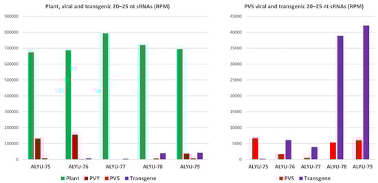 To reconstruct virome components (if any) present in each leaf sample, we used a previously developed pipeline for de novo assembly of viral genomes from siRNAs [,] (see Section 2). As a result, complete genome sequences of PVS and PVY were reconstructed from the non-transformed field plant of Zeren (ALYU-75), while a single complete PVY genome was reconstructed from each field plant of the transgenic lines #119 (Zeren; ALYU-76) and #103 (Kormilitsa; ALYU-79). Interestingly, the PVS isolate ALYU-75 (deposited in NCBI GenBank under accession number ON583978) shares 98.4% identity with the PVS isolate KZ.Fortune (MK442089), which was identified in Kazakhstan in 2016 and was then used by us for construction of the intron-hairpin RNA transgenes. The PVY isolates ALYU-75 (ON583979) and ALYU-79 share 100% identity with each other (being 99.9% identical to JF927753 collected in 2007 in Poland) and 98.7% identity with the PVY isolate ALYU-76 (ON583980) (being 99.8% identical to JF927754 collected in 2007 in Germany; see Dataset S1B for the reconstructed viral sequences). No virus was reconstructed from the transgenic line #61 (ALYU-78) of Dunyasha from the field (cured from PVM infection) or from the in vitro propagated transgenic line #119 (ALYU-77) of Zeren (cured from triple infection with PVS, PVM, and PVY). These results confirmed our field ELISA analysis, with the exception for the transgenic Kormilitsa line #103, which scored negative for any virus (Dataset S2), suggesting that PVY escaped from ELISA detection at the sampling time point in the field. Notably, sRNA contigs representing a complete or near-complete PVS 25K coding sequence—obviously assembled from the PVS 25K transgene-derived siRNAs (see below)—were reconstructed from all the four transgenic plant samples.