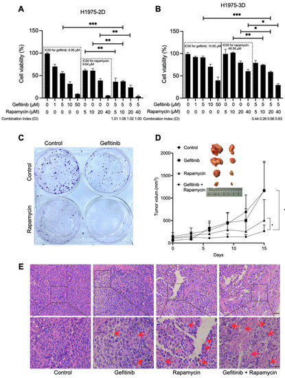 Combination therapy of rapamycin and gefitinib attenuates H1975 cell growth. (A) CCK-8 assay of 2D-cultured H1975 cells under the treatment with gefitinib, rapamycin, and their combination for 48 h at a gradient concentration, as indicated. ** p < 0.01 and *** p < 0.001. (B) Cell viability assay of 3D cultures under the treatment with gefitinib, rapamycin, and their combination for 48 h at a gradient concentration, as indicated. ** p < 0.01 and * p < 0.05. (C) Clonogenic assay performed in 2D-cultured H1975 cells treated with gefitinib (5 μM) and/or rapamycin (10 μM). (D) Photograph of harvested H1975 tumor xenografts after 15 days of treatment and tumor xenograft growth within 15 days of treatment. (Control: phosphate-buffered saline (PBS); gefitinib: 150 mg/kg; rapamycin: 2 mg/kg). * p < 0.05. (E) Light microscopic analysis of H&E-stained H1975 tumor xenograft sections after 15 days of treatment with different therapies. Red arrows indicate cell necrosis.