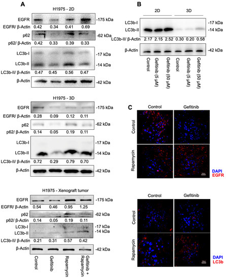 H1975 with different treatments were cultured in the 2D/3D cell culture system for 48 h and then lysed with RIPA lysis (Beyotime, Haimen, China) buffer at 4 °C. The DNA or Matrigel was removed via centrifugation (ThermoFisher, Waltham, MA, USA) at 10,000 rpm for 15 min. Total protein was quantified with a BCA Protein Assay Kit (ThermoFisher, USA) and then mixed with loading buffer and boiled at 100 °C for 10 min. Protein extracts (30 μg) were resolved and separated by 12.5% sodium dodecyl sulfate-polyacrylamide gel electrophoresis (SDS-PAGE) and then transferred to nitrocellulose membranes. The membrane was incubated in the sequence of blocking solution (5% non-fat milk) for 1 h, primary antibody EGFR, β-Actin, p62, and LC3b solution for 3 h, and HRP-tagged secondary antibody solution for 1 h at room temperature with gentle rocking. The nitrocellulose membranes were washed three times with phosphate-buffered saline with 0.05% Tween-20 (PBST) buffer before every incubation. Finally, the membrane was incubated with enhanced chemiluminescence for 5 min, and the blot was imaged using an X-ray imaging system (Bio-Rad, Hercules, CA, USA). Every experiment was performed at least 3 times. The relative ratio of EGFR, p62, and LC3b-II to β-Actin was evaluated using Image J software.