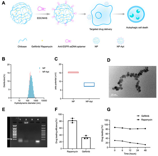 Construction and characterization of NP and NP-Apt. (A) Schematic illustration of gefitinib and rapamycin-loaded NP-Apt (NP-Apt [gefitinib + rapamycin]). (B) The hydrodynamic size distribution of NP and NP-Apt. (C) Zeta potential analysis of NP and NP-Apt. (D) TEM picture of NP-Apt. (E) Agarose gel electrophoresis. 1. The mixture of Apt and NP; 2. NP-Apt; 3. NP; 4. Free aptamer. (F) Drug loading efficiency of gefitinib and rapamycin. The maximum absorbance of gefitinib and rapamycin was 343 and 283 nm, respectively. (G) Stability of NP-Apt (gefitinib + rapamycin) at 37 °C in PBS.