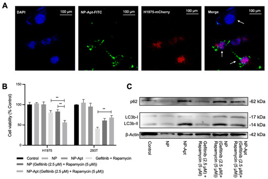 Target delivery and toxicity of NP−Apt (gefitinib + rapamycin). (A) Selective cell uptake of NP−Apt. H1975 cells 293T cells were co−cultured in one dish. H1975 cells displayed blue and red fluorescence due to the DAPI staining and mCherry transfection. The 293T cells displayed only blue fluorescence. NP−Apt were conjugated with FITC showing green fluorescence. White arrows indicate 293T and H1975 cells. (B) Cell viability assay 48 h of H1975 cells and 293T cells after various treatments: control (DMEM), NP, NP−Apt, gefitinib + rapamycin, NP (gefitinib + rapamycin), NP−Apt (gefitinib + rapamycin). The dosages of gefitinib and rapamycin were 2.5 and 5 μM. All data are representative of at least three independent experiments. ** p < 0.01. (C) Immunoblotting analysis of p62 and LC3b protein expression in H1975 cells under different treatments.