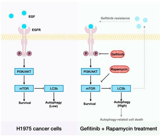 Our mechanistic studies have suggested that H1975 expresses low levels of EGFR when treated with gefitinib, and that there is a clear positive correlation between EGFR and cell autophagy induction (Figure 2A,C). Recently, Song et al. reported a novel LC3b–EGF–EGFR regulation in NANOG+ tumor cells and demonstrated that LC3b contributed to the secretion of EGF, thereby activating EGFR signaling [30]. Accordingly, we suggest that increased LC3b may lead to increased EGF–EGFR signaling and then relief gefitinib resistance in H1975 cells (Figure 5). To be specific, less EGFR expression made gefitinib useless, the arisen of other receptors on the cell membrane such as MET also contributes to gefitinib resistance in NSCLC cells [7]. When H1975 cells were treated with rapamycin and gefitinib simultaneously, rapamycin could first inhibit mTOR, lead to LC3b overexpression and thereby enhance EGF secretion. As the receptor of EGF, more EGFR will exist on the cell membrane, and the EGFR–AKT signaling pathway will become significant for cell survival. Next, gefitinib will inhibit EGFR and prevent cell proliferation. In the end, cells will die of autophagy-related mechanisms.