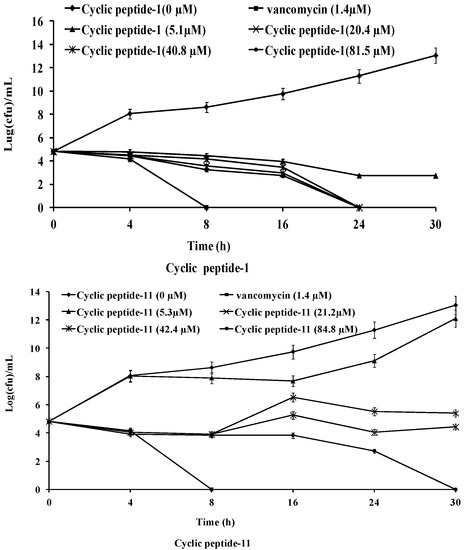 Time-kill curves of cyclic peptide-1, cyclic peptide-11, and cyclic peptide-14.
