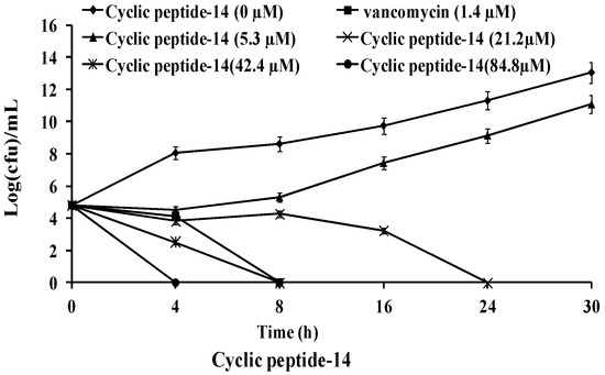 The killing kinetics of these three cyclic peptide compounds against MRSA ATCC43300 were analyzed by time-kill assays. As shown in Figure 1, MRSA ATCC43300 was completely killed within 24 h of incubation with cyclic peptide-1 at 4 × MIC. However, MRSA ATCC43300 was not completely killed until 30 h at 1 × MIC, leaving a growing litter bacteria. MRSA ATCC43300 was completely killed treating with cyclic peptide-11 within 8 h of incubation at 8 × MIC, while significant regrowth was observed at 1 × MIC, 2 × MIC, and 4 × MIC. Cyclic peptide-14 completely killed MRSA ATCC43300 within 4 h of incubation at 8 × MIC, within 8 h of incubation at 4 × MIC, and within 24 h of incubation at 2 × MIC. In addition, significant regrowth was observed at 1 × MIC after 24 h of incubation, indicating that cyclic peptide-14 is bacteriostatic at 1 × MIC.