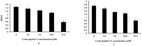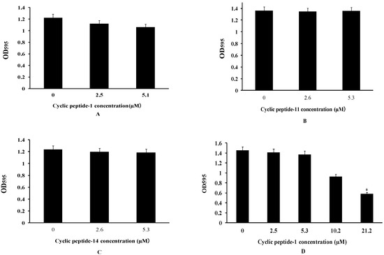 The inhibition of biofilm formation was assessed as described previously [49]. Briefly, a stationary-phase culture of MRSA 3390 (1 × 106 CFU/mL) in TSB-0.5% glucose was incubated in 24-well tissue culture microtiter plates at 37 °C for 24 h, with cyclic peptide-1, -11, and -14 at 0 µM, 2.6 µM, and 5.3 µM in 96-well tissue culture microtiter plates. The positive control was MRSA 3390 in TSB-0.5% glucose without cyclic peptides. After incubation, the wells were decanted and washed twice with phosphate buffer saline (pH 7.3). The wells were then stained with crystal violet (0.4%). The OD595 was measured.
