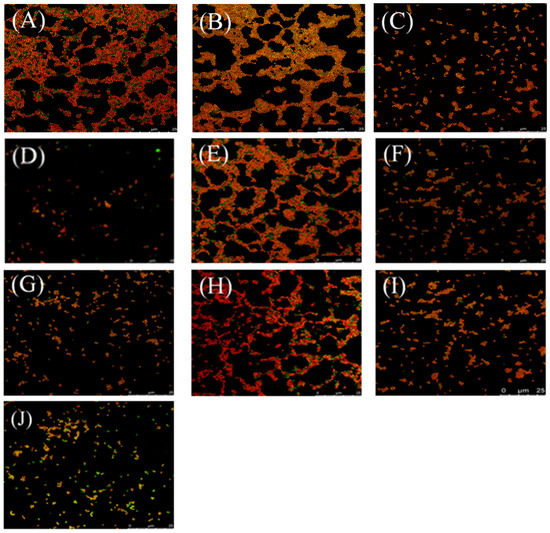 Effect of treating preformed biofilms of MRSA 3390 with cyclic peptide-1, 11, 14 at various concentrations for 24 h. The cyclic peptide-1, 11, 14 were present at 1 × MIC (B,E,H), 5 × MIC (C,F,I) and 10 × MIC (D,G,J) concentrations, respectively. (A) Controls with no cyclic peptide added. Biofilm bacteria were stained with SYTO 9 (green: live) and PI (red: dead). Bar = 25 μm.