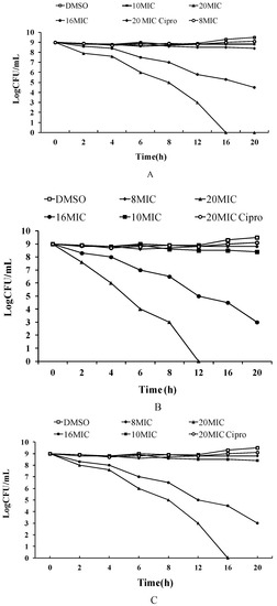 MIC assays were adapted according to the recommendations of the Clinical and Laboratory Standard Institute (CLSIM) [46,47]. MBCs were determined at the end of the incubation period by removing 20 µL samples from wells showing no growth on MHA plates, which were incubated for 24 h and examined for 99.9% killing.