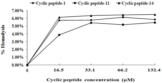 Minimal hemolytic concentration was determined as the lowest concentration of antimicrobials, which caused 10% hemolysis of erythrocytes. The percentage of hemolysis of cyclic peptide-1, cyclic peptide-11, and cyclic peptide-14 at 132.4 μM was 5.85%, 5.45%, and 6.49% respectively (Figure 6). Our results indicate that cyclic peptide-1, -11, and -14 yield the best therapeutic index.