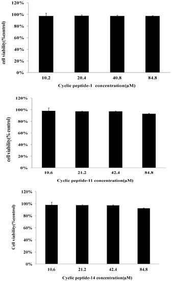 Cell survival after 48 h of incubation with different concentrations of cyclic peptides was evaluated by an MTT assay. The toxicity of cyclic peptide-1, -11, and -14 toward human liver L02 cells is shown in Figure 7. As negative controls, 5‰ DMSO was used. The low toxicity of cyclic peptide-1, -11, and -14 was observed against human liver L02 cells. The high concentrations required for cyclic peptide-1, -11, and -14 (84.8 μM) showed no significant loss in cell viability. These results indicate that cyclic peptide-11 and cyclic peptide-14 are safe for mammalian cells as an antibacterial agent.