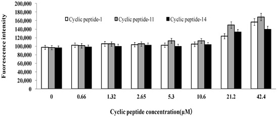We treated MRSA ATCC43300 with cyclic peptide-1, -11, and -14 and subsequently added propidium iodide, an indicator of membrane and cellular integrity. We found that concentrations of cyclic peptide-1, -11, and -14 less than 10.6 μM had no effect on membrane and cellular integrity (Figure 8). When the concentrations of the cyclic peptides were increased to 21.2 or 42.4 μM, the fluorescence intensity was higher than the intensity of 10.6 μM, indicating that the membrane and cellular integrity could be changed. The results reveal that cyclic peptide-1, -11, and -14 had no effect on membrane permeability, and this caused intracellular DNA and other intracellular material leakage, accelerating the death of bacteria.