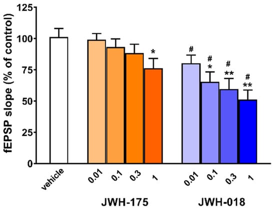 Effect of JWH-175 (0.01–1 µM) and JWH-018 (0.01–1 µM) on fEPSP of CA1 area of mouse hippocampal slice. Histogram reporting average effects at steady state, as average fEPSP slope of last 3 min of recording. Values correspond to % changes compared to control condition (average values of fEPSP slope 10 min before drug application). The analysis of the mean overall effect of each compound was performed with one-way ANOVA followed by Tukey’s test. * p < 0.05, ** p < 0.01 versus vehicle. Comparisons between JWH-018 and JWH-175 at the same concentrations were performed with unpaired t test. # p < 0.01 versus JWH-018.