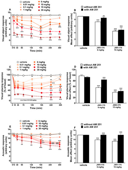 Effect of JWH-175 (0.01–30 mg/kg i.p.) on the visual object test (A), visual placing test (C), and acoustic response (E) in mice. Interactions of JWH-175 with the selective CB1 receptor antagonist AM-251 (6 mg/kg i.p.) are reported in histograms (B,D,F). Data are expressed as arbitrary units (visual object and acoustic responses) or as a percentage of baseline (visual placing response) and represent the mean ± SEM of 8 animals for each treatment. Statistical analysis was performed by two-way ANOVA followed by Bonferroni’s test (A,C,E) for multiple comparison for the dose–response curve of each compound at different time-points. The analysis of the mean overall effect of each compound and AM-251 (B,D,F) was performed with one-way ANOVA followed by Tukey’s test. * p < 0.05, ** p < 0.01, *** p < 0.001 versus vehicle; °° p < 0.01, °°° p < 0.001 versus JWH-175.