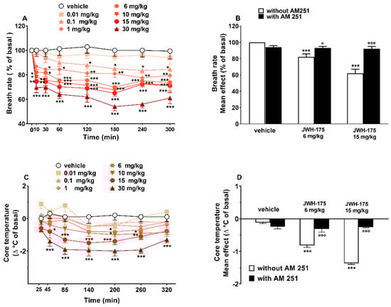 Effect of JWH-175 (0.01–30 mg/kg i.p.) on the breath rate (A) and core body temperature (C) in mice. Interactions of JWH-175 with the selective CB1 receptor antagonist AM-251 (6 mg/kg i.p.) are reported in histograms (B,D). Data are expressed as percentage of baseline (breath rate) and as the difference between control temperature (before injection) and temperature following drug administration (Δ°C of basal) and represent the mean ± SEM of 8 animals for each treatment. Statistical analysis was performed by two-way ANOVA followed by Bonferroni’s test (A,C) for multiple comparison for the dose–response curve of each compound at different time-points. The analysis of the mean overall effect of each compound and AM-251 (B,D) was performed with one-way ANOVA followed by Tukey’s test. * p < 0.05, ** p < 0.01, *** p < 0.001 versus vehicle; ° p < 0.05, °°° p < 0.001 versus JWH-175.
