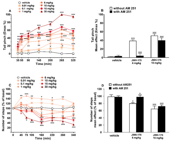 Effect of JWH-175 (0.01–30 mg/kg i.p.) on the tail pinch test (A) and drag test (C) in mice. Interactions of JWH-175 with the selective CB1 receptor antagonist AM-251 (6 mg/kg i.p.) are reported in histograms (B,D). Data are expressed as percent of maximum effect (Emax %; tail pinch test) and as percent of baseline (drag test) and represent the mean ± SEM of 8 animals for each treatment. Statistical analysis was performed by two-way ANOVA followed by Bonferroni’s test (A,C) for multiple comparison for the dose–response curve of each compound at different time-points. The analysis of the mean overall effect of each compound and AM-251 (B,D) was performed with one-way ANOVA followed by Tukey’s test. * p < 0.05, ** p < 0.01, *** p < 0.001 versus vehicle; ° p < 0.05, °°° p < 0.001 versus JWH-175.