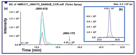 Extracted chromatogram of a representative plasma sample collected from mice after 30 min by the intake of JWH-175 (a). Chromatogram enlargement of the plasma level section of JWH-175 (b).
