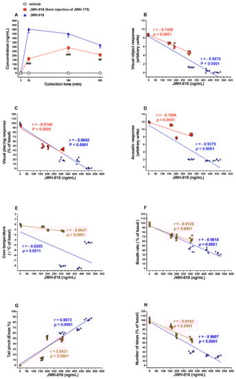 Concentration of JWH-018 in the plasma of mice detected at 30, 180, and 300 min after the injection of JWH-175 (10 mg/kg i.p.) and JWH-018 (10 mg/kg i.p.; (A)). Results are expressed as ng/mL and represent the mean ± SEM of 6 samples for each time point. Correlation between visual object (B), visual placing (C) and acoustic (D) responses, body temperature (E), breath rate (F), mechanical analgesia (G), and motor activity (H) changes with JWH-018 plasma concentrations. Correlation coefficients were determined by performing Pearson’s correlation calculation. ## p < 0.01, ### p < 0.001 versus JWH-018.