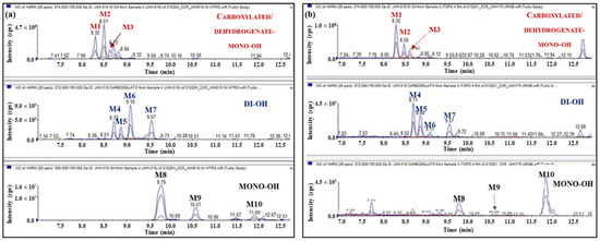 Extracted chromatograms obtained from the analysis of a representative urine sample collected from mice after JWH-175 administration (a) and from the analysis of samples obtained by incubating JWH-018 in the presence of HLMs (b). The phase I metabolites in common between JWH-018 and JWH-175 are three di-hydroxylated metabolites (M1–M3), four dehydrogenate-mono-OH metabolites (M4–M7), and three mono-hydroxylated metabolites (M8–M10).