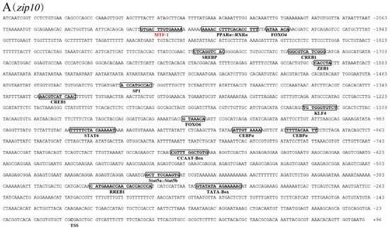 In the eukaryotes, transcription factors initiate and regulate gene expression via their binding locus in the promoter. For example, the TFs of NRF1 and the Smad3 binding site were found in the promoter region of the troc1 gene and play repressing roles in troc1 expression [22]. Liang et al. [23] reported that TFs of ACSL1 and ASCL2 transcriptionally regulated the fam13a gene through the binding region in its promoter. MTF-1, which possesses six Cys2-His2 zinc finger structures specializing in the binding of Zn, is a crucial transcription factor for inducing the transcription of some genes that are associated with Zn homeostasis [24]. MTF-1 first binds with Zn in the cytoplasm and then translocates into the nucleus, where it binds to a specific sequence, MRE, and regulates its target genes [25,26]. MRE elements are present in the promotor regions of many Zn transporters, such as the znt1, znt2, znt6, znt8, zip3, and zip8 transporters of P. fulvidraco [27,28], the zip10 transporter of zebrafish [14], and the znt1, znt2, and the znt5 transporter in mammals [29,30,31]. Krüppel-like factor 4 (KLF4) is another crucial zinc finger transcription factor [32]. Liuzzi et al. [33] found that Zn deprivation increased the binding of KLF4 to the zip4 promoter of mice and, thus, regulated the adaptive expression of zip4. Other studies concerning KLF4 and zip13 led us to speculate that there is an enigmatic connection between KLF4 and Zn homeostasis that is mediated by zip13 [16,34]. The signal transducer and activator of transcription 3 (STAT3) belongs to the JAK/STAT signaling pathway family. STAT3 possesses DNA-binding activity and is capable of interacting with enhancer elements in the promoters of downstream genes [35]. Studies suggested that Zn increased the gene expression level of STAT3 [36] but suppressed the STAT3 signaling cascade [37]. Cousins et al. [38] reported that phosphorylated STAT are capable of regulating the transcription of zip14. Thus, it is valuable to investigate whether these transcription factors mediate the transcriptional regulation of zip members zip10, zip13, and zip14.