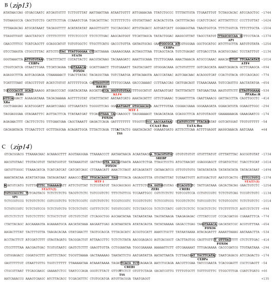 The nucleotide sequences of the zip10, zip13, and zip14 promoters of P. fulvidraco. (A) zip10; (B) zip13; (C) zip14. Numbers represent the relative distance from the corresponding position to the transcription start site (TSS). The putative TFBSs are boxed in the rectangle. The sequences above the red characters represent the MRE, the KLF4 binding site, and the STAT3 binding site of these promoters.