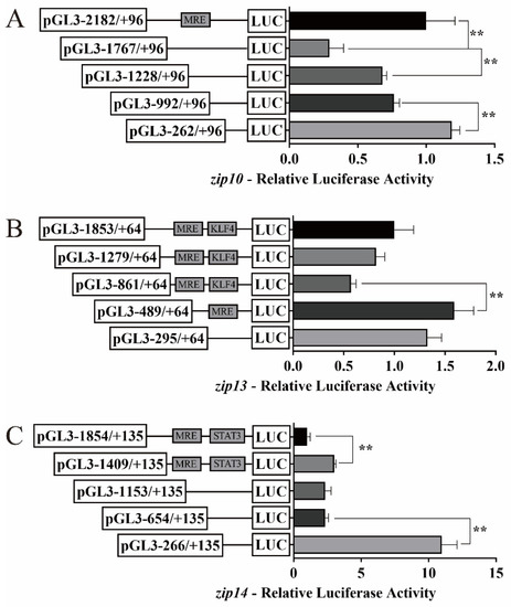 5′-unidirectional deletion assays of zip10, zip13, and zip14 promoters of P. fulvidraco. (A) zip10; (B) zip13; (C) zip14. Values mean the ratio of Firefly to Renilla luciferase activities, normalized to the control plasmid. The putative MRE, KLF4 binding site, and STAT3 binding site boxed in the rectangle indicate that they were not deleted by mutation. Results are presented as mean ± SEM (n = 3). Student t-test was used to evaluate the difference. Asterisks (**) mean significant differences between the two groups (p < 0.05).