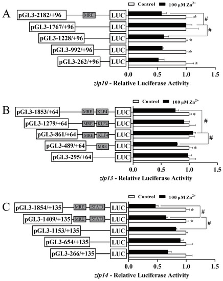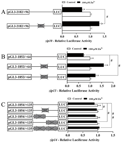 Micronutrient zinc (Zn) is an essentially functional and structural element for all living organisms, including fish [1]. Both a dietary deficiency and an excess of this micronutrient are deleterious to the growth and development of fish [2]. Zinc deficiency results in growth repression and zinc excess results in toxicity for many fish [3]. Waterborne zinc could also cause chronic toxicity for rainbow trout and other fish [4]. Thus, intracellular free Zn2+ must be maintained at a required reasonable level by various Zn transporters, buffering metallothioneins, and sequestering vesicles [5]. For example, in the zebrafish, Zip6 is required for zinc homeostasis maintenance in T-cell development [6] and pigmented cells store zinc and maintain zinc homeostasis through Znt8 [7]. In rainbow trout, MT and other zinc-binding proteins contribute to normal zinc homeostasis in liver cells [8]. Zn transporters, which are SLC39A (Zip) family members, control Zn influx that is assimilated from the extracellular space or released from the intracellular compartment to the cytoplasm. Among the Zn transporters are three LIV-1 subfamily members (Zip10, Zip13, and Zip14) that are responsible for the increment of Zn2+ concentration within the cytoplasm of many vertebrates. Each of the three Zip proteins usually forms a heterodimer with another protein and thus plays a functional role. For example, Zip10 forms a heterodimer with Zip6 to facilitate zinc flux to trigger mitosis [9]. Zip13 possesses some domains that are not found in other LIV-1 family members and Zip13 itself may form a homodimer [10]. Aydemir et al. [11] reported that Zip14 might act as a heterodimer with Zip8 to maintain an optimum zinc concentration in mitochondria. Due to these specialties of Zip10, Zip13, and Zip14, we considered it interesting and valuable to explore their transcription regulation. In some vertebrates, several studies explored the responses of these proteins to Zn. For instance, Croxford et al. [12] reported that the zip10 mRNA level was not influenced by Zn2+ deficiency, but the protein level of Zip10 were downregulated in response to zinc deficiency in mouse testes. Zheng et al. [13] reported that in zebrafish gill, zinc excess reduced the mRNA expression level of zip10 and that zebrafish Zip10 acts as a zinc importer for X. laevis oocytes. Lichten et al. [14] reported that high Zn incubation downregulated the zip10 mRNA expression level in mouse hepatocytes, the AML12 cell line, and the neuro 2a cell line. Further investigation revealed that the mouse mZip10 localized to the AML12 cell membrane and functioned as a Zn2+ importer, and that Zn deficiency enriched its localization in the cell membrane [14]. Lee and Bin [15] reported that hZip13 was located on the Golgi of hMSCs and directly mediated Zn homeostasis. Fukada et al. [16] reported that Zip13 disturbance could result in the disorder of intracellular Zn homeostasis. Jeong et al. [17] reported that Zn deficiency elevated the zip13 mRNA and protein level in HeLa cells. Xu et al. [18] reported that Zip13 released zinc from the vesicular store to the cytoplasm that is required for the normal function of ER and that 1 mM of Zn could increase the protein level of dZip13. Liuzzi et al. [19] reported that Zip14 was located in the plasma membrane of the hepatocytes and increased the Zn concentration of the hepatocytes in mice with hypozincemia. Kim et al. [20] reported that Zip14 was located in the cell membrane and mediated Zn homeostasis. Recently, in our laboratory, Chen et al. [21] found that high Zn administration reduced the zip10, zip13, and zip14 mRNA levels in both the hepatocytes and the intestinal epithelial cells of yellow catfish. Thus, all of these studies indicated that Zip10, Zip13, and Zip14 were regulated by Zn. However, the underlying regulatory mechanisms have received very little attention and remain confusing.