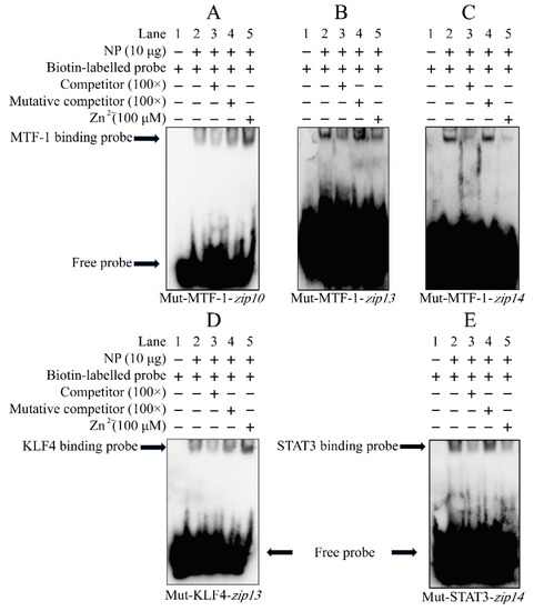 EMSA of the predicted MTF-1, KLF4, and STAT3 binding sequences on the zip10, zip13, and zip14 promoters of P. fulvidraco. (A) MTF-1 binding sites between −2017 bp and −2004 bp in zip10 promoter; (B) MTF-1 binding sites between −360 bp and −345 bp in the zip13 promoter; (C) MTF-1 binding sites between −1457 bp and −1442 bp in the zip14 promoter; (D) KLF4 binding site between −606 bp and −594 bp in the zip10 promoter; (E) STAT3 binding site between −1383 bp and −1375 bp of the zip14 promoter. NP: nuclear protein. The numbers 1–5 represent the five lanes, respectively.
