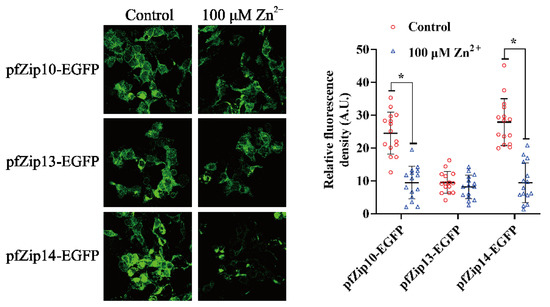 Next, we explored whether the pfZip10, pfZip13, and pfZip14 protein expressions were post-translationally regulated by Zn. Due to the absence of available antibodies, we tagged them with the EGFP, which can release the green fluorescence after being excited by ultraviolet light. The analysis method was adopted according to Shihan et al. [46]. In brief, we first used a confocal microscope to catch fluorescent images. Then, the images were inverted into 8-bit one and gray background via Image J. After setting identical upper and lower thresholds for a single EGFP-tagged protein, the images were subjected to calculate the mean fluorescent intensity (Mean). A similar method was also used in other studies [47,48]. The administration of 100 μM Zn significantly reduced the relative green fluorescent intensities of the pfZip10-EGFP and the pfZip14-EGFP, but not that of the pfZip13-EGFP, indicating that the pfZip10 and pfZip14 proteins were post-translationally regulated by Zn (Figure 6).