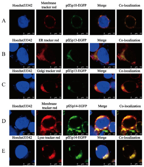 We further investigated the pfZips’ subcellular localization. The HEK293T cells were seeded on coverslips, and the transfection of the constructed pcDNA3.1-pfZip10-EGFP, pcDNA3.1-pfZip13-EGFP, and pcDNA3.1-pfZip14-EGFP and the cell-washing were as indicated in the Section 2.4. Then, the membrane tracker (red) (Dil, 1:400), the lysosome tracker (red) (DND-99, 1:1000), the ER tracker (red) (Glipalamides, 1:1000), or the Golgi tracker (red) (C5-ceramide, 1:100) were used to track the cell membrane, the lysosome, the endoplasmic reticulum (ER), or the Golgi apparatus, respectively. To stain the nuclei, the cells were washed with PBS and then incubated in 10 g/mL Hoechst for 10 min. After several washes via PBS, coverslips were mounted on the microscope slides for the confocal imaging, using a Leica TCS SP8 laser-scanning confocal microscope.