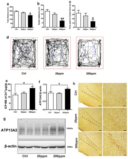 Compared with the control group, mice in the 20 ppm group exhibited a slight reduction in the total distance, but it was not statistically significant; the total distance in the 200 ppm group was significantly shorter than that of the control group (p < 0.05) (Figure 1a,d). Additionally, mice in the 20 ppm group presented a shorter movement distance and spent less time in the central zone, although this reduction was not significant. Meanwhile, the mice in the 200 ppm group spent less time and presented a shorter distance in the central area than the control group did (p < 0.05) (Figure 1b–d). Furthermore, the anxiety levels (spent less time in the central zone) in the mice of the 200 ppm group were higher than that of mice in the control group, and their ability to explore new environments was relatively weak. Altogether, these results suggested that treatment with 200 ppm ZnSO4 significantly reduced the spatial exploration ability and aggravated anxiety in mice.