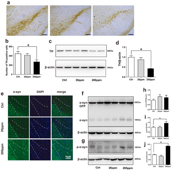 Tyrosine hydroxylase (TH) catalyzes the rate-limiting step in the synthesis of dopamine [62]. Hence, the lack of TH notably affects dopamine synthesis. Based on this, we aimed to evaluate whether Zn2+ imbalance altered the expression levels of TH. Immunohistochemistry staining revealed that TH levels were significantly lower in the substantia nigra pars compacta of mice in the 200 ppm group than those in the control mice. However, TH levels in mice in the 20 ppm Zn2+ did not significantly differ from those of the control group (Figure 2a,b). Western blot analysis also revealed that 200 ppm of Zn2+ significantly reduced TH expression compared to that in the control group (Figure 2c,d).
