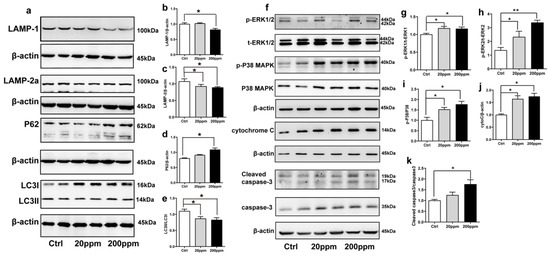 Effects of Zn2+ on autophagy–lysosome and apoptosis pathways in mice. Autophagy–lysosome pathway ((a), representative pictures; (b–e), quantification): the expression levels of LAMP-1 (a,b), LAMP-2a (a,c), P62 (a,d), LC3 I and LC3 II ((a,e) quantification of ratio of LC3II to LC3I) were determined through Western blot analysis using β-actin as an internal control. Apoptosis pathway ((f), representative pictures; (g–k), quantification): the p-ERK1 (f,g), p-ERK2 (f,h), p-p38 (f,i), cleaved caspase 3 (f,k) levels and the total protein levels of ERK1/2, p38, caspase 3 and expression levels of cytochrome C (f,j) were determined using Western blotting with β-actin as an internal control. Data are represented as the means ± SEM of at least three independent experiments (n = 6). * p < 0.05, ** p < 0.01 with respect to the control group.