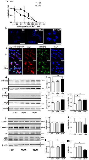 Effects of Zn2+ on ATP13A2, α-synuclein, and autophagy–lysosome pathway in HEK293 α-synuclein-DsRed cells. (a) Cell viability of HEK293 α-synuclein-DsRed cells incubated with different concentrations of Zn2+ for 12 and 24 h. All values are presented as the mean ± standard error of the mean (SEM) of at least three independent experiments. (b) TSQ staining was used to verify the zinc fluorescence intensity in HEK293 α-synuclein-DsRed cells with a medium containing 10 or 75 μM ZnSO4. Bar = 25 μm. (c) HEK293 α-synuclein-DsRed cells were untreated or treated with 75 μM ZnSO4 for 12 h. Cells were observed using confocal microscopy after staining with ATP13A2 and DAPI. The spontaneous red fluorescence of HEK293 α-synuclein-DsRed cells represented the expression levels of α-synuclein. Scale bar = 25 μm. (d–m) HEK293 α-synuclein-DsRed cells were treated with 10 or 75 μM ZnSO4 for 12 h. Immunoblot images ((d,f), left panels) and quantification ((e,g,h), right panels) show the expression of ATP13A2 (d), p-α-synuclein and α-synuclein (f) in the HEK293 α-synuclein-DsRed cells. Autophagy–lysosome pathway ((i), representative pictures; (j–m) quantification): the expression levels of LAMP-1 (i,j), LAMP-2a (i,k), P62 (i,l), LC3 I and LC3 II ((i,m), quantification of ratio of LC3II to LC3I) were determined using Western blot analysis with β-actin as an internal control. All data from at least three independent experiments are represented as the means ± SEM. * p < 0.05, ** p < 0.01 with respect to the control group.