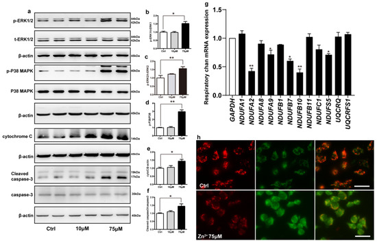 Next, we examined whether apoptosis induced by the ERK/P38 signaling pathway leads to impairment of mitochondrial function. Mitochondrial complexes I and III are important components of the mitochondrial respiratory chain. Deletion of the mitochondrial complex I and III subunits affects the enzymatic activity of the complexes, which in turn blocks electron transport through the respiratory chain and leads to the accumulation of ROS [67,68]. We selected a total of 12 important subunits from complexes I and III [69,70] and assessed their expression levels using RT-qPCR after treating the cells with 75 μM ZnSO4. Treatment with 75 μM ZnSO4 remarkably decreased the mRNA expression levels of five subunits of mitochondrial complex I, namely NDUFA2, NDUFA9, NDUFB7, NDUFB10, and NDUFS5; however, the mRNA expression levels of the other subunits analyzed remained unaltered (Figure 5g).
