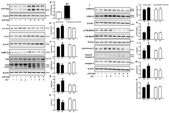 Overexpression of ATP13A2 inhibits zinc-induced autophagy–lysosome and ERK/P38 signaling pathways. The ATP13A2-pcDNA3.1-HA plasmid (ATP13A2 overexpression group) and the pcDNA3.1-HA empty vector (empty vector group) were transiently transfected into HEK293 α-synuclein-DsRed cells, and the ATP13A2 overexpression group and the empty vector group were treated or untreated with 75 μM ZnSO4 for 12 h. (a,b) ATP13A2 levels were detected through Western blotting and quantitative analyses (a, representative pictures; b, quantification). Autophagy–lysosome pathway (c, representative pictures; d-h quantification): the expression levels of p-α-synuclein (c,d), α-synuclein (c,e), LAMP-2a (c,f), P62 (c,g), LC3 I and LC3 II ((c,h), quantification of ratio of LC3II to LC3I) were determined using Western blot analysis with β-actin as an internal control. Apoptosis pathway ((i), representative pictures; j-n, quantification): the p-ERK1 (i,j), p-ERK2 (i,k), p-p38 (i,l), cleaved caspase 3 (i,n) levels and the total protein levels of ERK1/2, p38, caspase 3 and expression levels of cytochrome C (i,m) were determined via Western blotting with β-actin as an internal control. Data are represented as the means ± SEM of at least three independent experiments. * p < 0.05, ** p < 0.01 with respect to the control group.