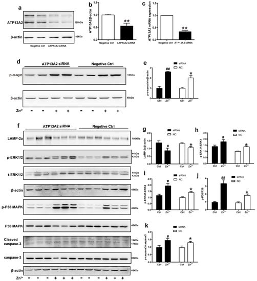 ATP13A2 siRNA promotes zinc-induced activation of the ERK/P38 signaling pathway. The ATP13A2 siRNA and the negative control were transiently transfected into HEK293 α-synuclein-DsRed cells, and then the cells were treated or untreated with 75 μM ZnSO4 for 12 h. (a,b) ATP13A2 levels were detected using Western blotting and quantitative analyses ((a), representative pictures; (b), quantification). (c) The mRNA expression levels of ATP13A2 were determined via qRT-PCR using GAPDH as an internal control ((d,f) representative pictures; (e,g–k) quantification). The expression levels of p-α-synuclein (d,e) and LAMP-2a (f,g), the phosphorylation and total protein levels of ERK1/2 (f,h,i), p38 (f,j) and caspase 3 (f,k) were determined using Western blotting with β-actin as an internal control. Data are represented as the means ± SEM of at least three independent experiments. * p < 0.05, ** p < 0.01 with respect to the control in the negative control group; # p < 0.05, ## p < 0.01 compared to the control in the ATP13A2 silencing group.