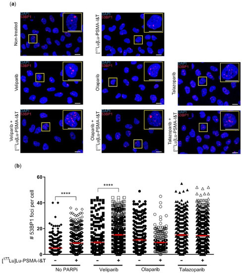 PC3-PIP cells were treated in suspension for 3 h with or without 0.3 MBq/mL [177Lu]Lu-PSMA-I&T, washed 1× with PBS and seeded onto coverslips in 6-well plates, with culture medium with or without PARPi (1 µM veliparib, 0.1 µM olaparib or 1.5 nM talazoparib, the IC50 concentrations of the monotherapy survival assays). 3 days after [177Lu]Lu-PSMA-I&T incubation, the cells were washed with PBS and fixed with 2% paraformaldehyde in PBS for 15 min at RT. Next, the cells were washed once with PBS, 2 times for 10 min with PBS + 0.1% Triton X-100 and once for 30 min with PBS+ (100 mL PBS + 0.5 g BSA + 0.15 g glycine). Subsequently, the cells were incubated with the primary antibody, anti-53BP1 (1:1000, rabbit (Novus Biologicals, Abingdon, UK) in PBS+ for 90 min at RT. Hereafter the cells were washed using PBS + 0.1% Triton X-100 and incubated with the secondary antibody, goat anti-mouse Alexa Fluor 594 (1:1000 (Thermo Fisher Scientific, Waltham, MA, USA) for 60 min at RT. The cells were then washed with PBS + 0.1% Triton X-100 and mounted with Vectashield + Dapi (Vector Laboratories, Newark, CA, USA). Fluorescent imaging was performed using z-stack acquisition (63× oil lens, 2× zoom) on a SP5 confocal microscope (Leica Biosystems, Nussloch, Germany). The images were analyzed using Image J software version 1.53k (National Institutes of Health, Bethesda, MD, USA) with a custom-made macro. In short, of each image the z-stack was compressed and each cell was segmented, based on the DAPI staining, into regions of interest (ROI). Within each ROI, 53BP1-foci were segmented and counted. For each experiment, 6–8 fields of view were imaged of each condition, with 20–60 cells per image. This experiment was performed as 3 independent experiments.