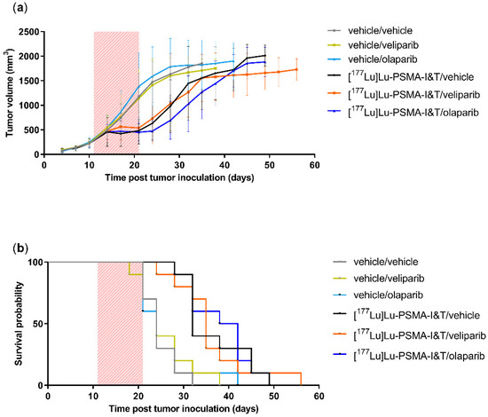 In vivo valuation of [177Lu]Lu-PSMA-I&T effectivity in combination with PARPi. (a) Average tumor volume and (b) survival probability. The red box indicates the treatment period with one injection of [177Lu]Lu-PSMA-I&T or vehicle at day 11 and subsequent daily dosing by oral gavage of the PARPi or vehicle from day 11 until day 21. Error bars indicate standard deviation. The tumor growth of each individual animal can be found in Supplementary Materials Figure S2.
