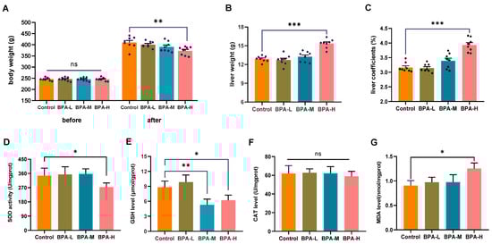Effects of BPA on liver oxidative stress in rats. (A) Changes in body weight before and after the experiment. (B) Liver weight and (C) liver coefficients of rats. (D) SOD, (E) GSH, (F) CAT, and (G) MDA in BPA-treated rats. Data are shown as the mean ± SEM (n = 8). * p < 0.05, ** p < 0.01, *** p < 0.001 compared with the Control group. ns: no significance.