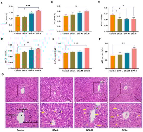 Effects of BPA on serum levels of (A) TC, (B) TG, (C) HDL-C, (D) LDL-C, (E) ALT, and (F) AST. These data were expressed as means ± SEM (n = 8). * p < 0.05, ** p < 0.01 and *** p < 0.001 versus the Control. Histological sections of the liver were stained with hematoxylin-eosin (HE) (200×, 400×) (G). ✱ steatosis; Yellow arrows: sinusoidal dilatation and congestion; ★ infiltration of inflammatory cells; ▲ necrosis. ns: no significance.