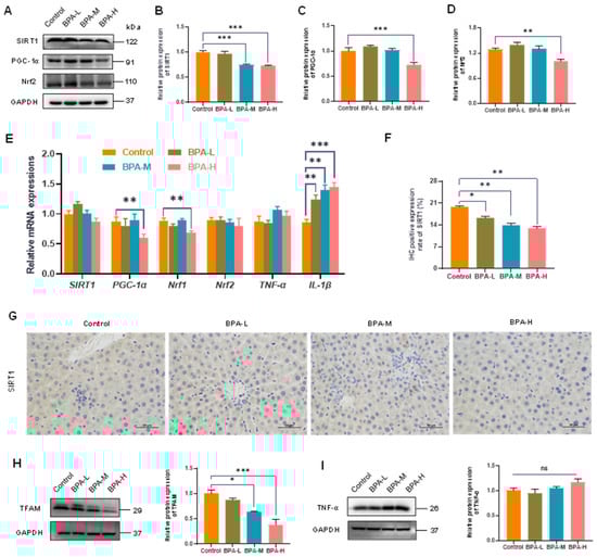 Effects of BPA on the liver SIRT1/PGC-1α pathway. (A) The relative protein levels of PGC-1α, Nrf2, and SIRT1. (B–D) Values of quantitative analysis (n = 4). (E) Relative mRNA levels of SIRT1, PGC-1α, Nrf1, Nrf2, TNF-α, and IL-1β. (F) Percentage of immunostaining for Sirt1. (G) Immunohistochemistry shows the expression of hepatic SIRT1 (400× magnifications). (H) The relative protein levels of TFAM and (I) the relative protein levels of TNF-α. Data are presented as mean ± SEM. * p < 0.05, ** p < 0.01, *** p < 0.01 vs. control group. ns: no significance.