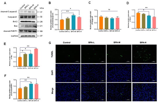 Effects of BPA on apoptosis in the liver from mice treated for 30 days. (A) Western blot analysis of apoptosis-related protein levels, and (B–F) grey-scale of quantitative analysis. Values are mean ± SEM (n = 4). * p < 0.05, ** p < 0.01, compared to the Control group. ns: no significance. (G) Representative TUNEL images of liver tissues.