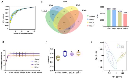 Effects of BPA on the structure of gut microbiota. (A) OTU numbers. (B) Venn diagram illustrated the unique and shared OTUs among groups. (C) Shannon rarefaction curve, (D) Simpson index, and (E) PCA of gut microbiota communities. * p < 0.05 vs. Control group.