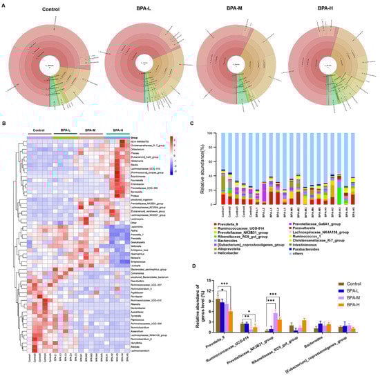 To determine whether there were differences in the structure of the gut microbiota, we used Krona to illustrate the abundance of gut microbiota composition in each group at different classification levels. At the phylum level, Bacteroidetes (71% vs. 69% vs. 57% vs. 54%), and Firmicutes (16% vs. 26% vs. 36% vs. 33%) are the main dominant phyla followed by Proteobacteria (3% vs. 3% vs. 2% vs. 8%), and Epsilonbacteraeota (4% vs. 2% vs. 5% vs. 4%) for the Control, low dosage of BPA (BPA-L), BPA-M, and BPA-H groups, respectively. Bacteroidetes was the most abundant phylum in feces, and the relative abundance was the highest in the Control group. A high dose of BPA administration caused the relative abundance of Bacteroidetes to decrease by 17%, while Firmicutes increased by 17% (Figure 6A). According to the abundance information in each sample, hierarchical cluster analysis of the microbial profiles at the genus level indicated which species are more or less concentrated in which samples. The microbial spectrum of BPA groups was different from that of the control group. Oribacterium, Enterobacter, Prevotellaceae_UCG-003, Lachnospiraceae_UCG-010, Eubacterium_hallii_group, Phocea, Blautia, Holdemania, Butyricimonas, Barnesiella, Proteus, Ruminococcus_torques_group, and Fournierella were mainly clustered in the BPA-H group, whereas Alistipes, Anaerofilum, Desulfovibrio, Lachnoclostridium, Lachnospiraceae_NK4A136_group, Papillibacter, Parvibacter, Peptococcus, and Ruminiclostridium were gathered in the Control group (Figure 6B). Moreover, the most abundant OTUs with statistical differences at the genus level are shown in Figure 6C,D. BPA exposure significantly decreased the abundance of Prevotella_9 (p < 0.05, p < 0.001) and Ruminococcaceae_UCG-014 (p < 0.05, p < 0.01), while the abundance of Prevotellaceae_NK3B31_group was significantly increased (p < 0.001).
