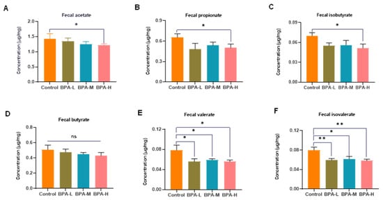 Effects of BPA on the fecal SCFA levels. (A) Acetate, (B) propionate, (C) isobutyrate, (D) butyrate, (E) valerate, and (F) isovalerate. Values were expressed as mean ± SEM in each group (n = 8). * p < 0.05, ** p < 0.01 compared with the Control group. ns: no significance.