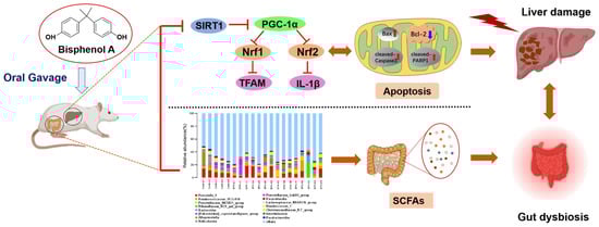 In conclusion, the present study indicated that BPA-induced liver toxicity by inducing oxidative stress, promoting mitochondrial apoptosis, and inhibiting the SIRT1/PGC-1α signaling pathway. In addition, BPA exposure also led to the disturbance of intestinal flora and the reduction of SCFAs levels, which is associated with hepatoxicity (Figure 8). These findings offer novel insights into the emerging research area to evaluate the impact of BPA on the liver and intestinal flora. The in-depth mechanism between microbiome and liver injury induced by BPA needs to be further explored through added antibiotics.