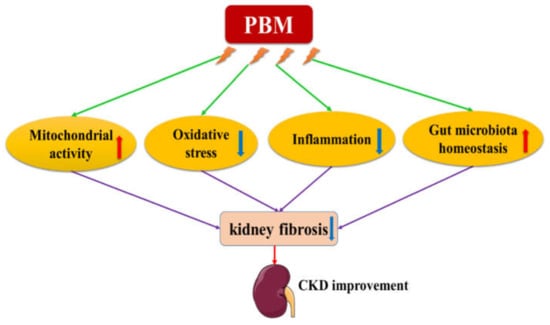 In summary, PBM might exert its beneficial effect by targeting kidney directly or indirectly (PBM being applied remote from the kidney area) through systemic effects. As shown in Figure 1, PBM might have the potential to improve kidney function via promoting mitochondrial activity, suppressing oxidative stress, inhibiting inflammation, and restoring gut microbiota homeostasis.